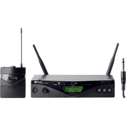 The AKG WMS 450 Wireless Guitar Set includes the PT 450 bodypack tranmitter, SR 450 receiver, MKG L instrument cable, belt clip, AA size battery, 2 antennas, rack mounting kit, and power supply. The AKG WMS 450 is your best choice for any application calling for a solution that is more flexible than a simple plug-and-play system yet easy to set up and operate. The WMS 450 provides a cost-efficient, high-performance solution for situations where several radio mics will be used simultaneously, including gigs at small clubs, small stages, or regional events. Using several single-channel systems has its limitations and may simply be too much for the available radio band.PT 450 bodypack transmitter The PT 450 is a high-performance, compact bodypack transmitter for a host of applications. Many innovative features enhance both system reliability and user friendliness.An LC display indicates all important system data at a glance, including the selected frequency in MHz or as a Preset subchannel, available battery capacity in hours, a warning when battery capacity is low, as well as the current transmission mode.Once you have set a frequency on the receiver, an infrared transmission link will feed the related data to the assigned transmitter within seconds, making the setting up of large multichannel systems childs play. The PT 450 uses a rugged case, and the mini XLR input allows you to connect a wide selection of microphones and instruments.