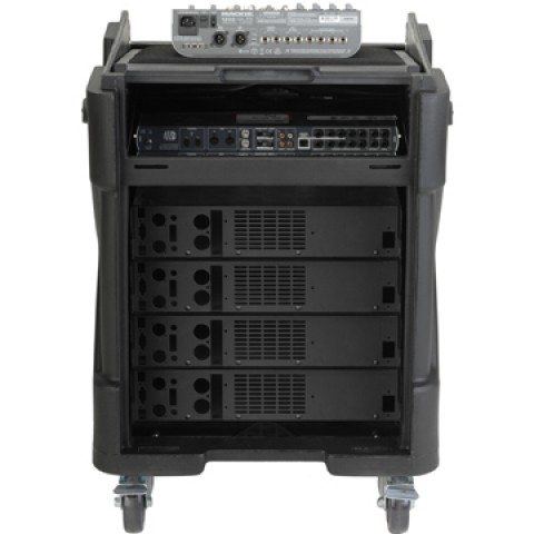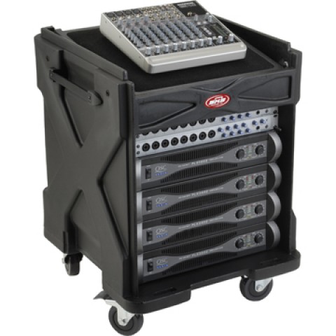The SKB Gig Rig has a Roto-Molded ergonomic design with a completely adjustable pop-up Velcro board on top. Its 10-space rackmount area can accommodate a wide variety of mixers, audio rack gear, and accessories. Improved locking systems. Lids, front panel and much larger rear access panel lift apart and reassemble more securely. For more capacity, check out the useful RotoRoller (SKB-1906). Rackable Mount Depth: 17" from front of rail to back of case. Exterior dimensions: 22-1/4"W; 24"D; 27 3/4"H; (add 5"H with wheels). Weight: 65 lbs. All SKB hardshell cases are unconditionally guaranteed forever. That means if you break it, they will repair or replace it at no cost to you