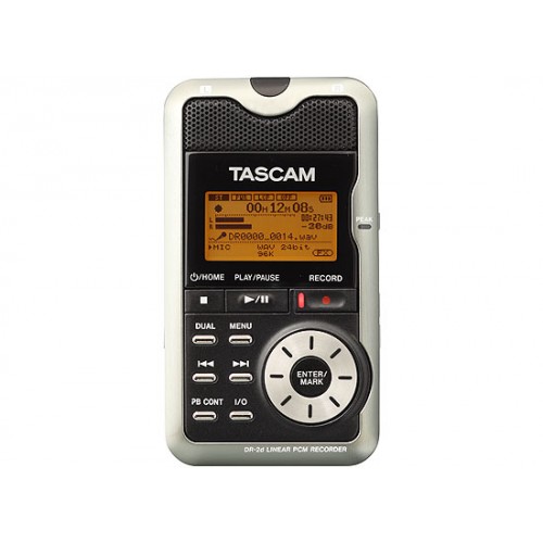 TASCAM's DR-2d Portable Digital Recorder brings high-resolution recording to a compact, affordable package. It offers up to 96kHz/24-bit WAV or MP3 recording to SD cards, and recordings can be transferred to computer through high-speed USB 2.0. A new dual recording feature records a copy of your audio at a lower level, so if the level suddenly jumps you have a backup instead of a distorted performance. Record using the new built-in condenser microphones or plug in your own. You can slow down recordings without changing the pitch, and there's even a metronome and built-in speaker. The DR-2d provides hours of recording time using a pair of AA batteries. making it the perfect partner for songwriting, live performance, rehearsal or home studio recording.